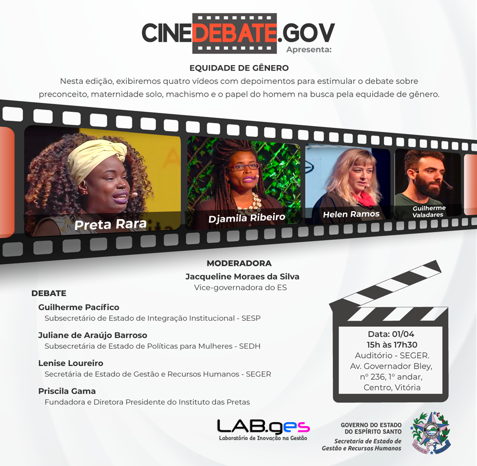 O Laboratório de Inovação da Secretaria de Estado de Gestão e Recursos Humanos (LAB.ges/Seger) promove na próxima segunda-feira (1º), às 15 horas, uma nova edição do Cinedebate.gov. Com o tema Equidade de Gênero, o encontro acontecerá no Auditório do Edifício Fábio Ruschi, no Centro de Vitória e será aberto ao público.