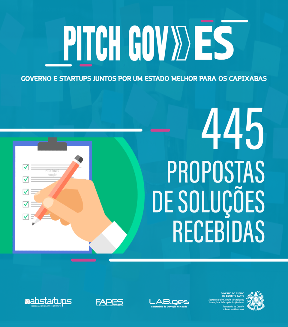 O Pitch Gov.ES, programa do Governo do Estado, em parceria com a Associação Brasileira de Startups (ABStartup), recebeu 445 propostas de soluções para os desafios da gestão pública. Elas foram encaminhadas, de 16 julho a 28 de agosto deste ano, por empresas de base tecnológica de todo o País, após publicação de edital de chamada pública.