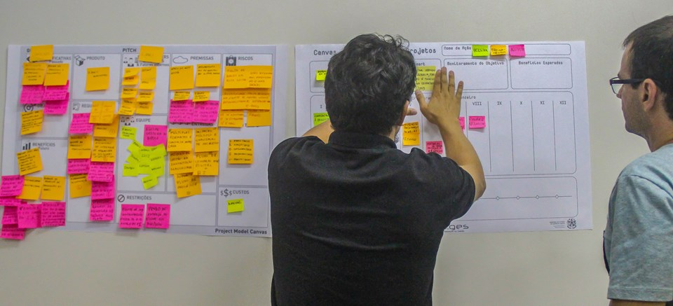 Na parte da manhã, a equipe do Escritório de Projetos da Secretaria de Estado de Gestão e Recursos Humanos (Seger) utilizou o “Project Model Canvas”, conhecido como canvas de projeto, desenvolvido pelo professor José Finnochio. Seguindo a expertise do LAB.ges/Seger em metodologias ativas de aprendizagem, as equipes utilizaram a ferramenta inserindo as informações de seus projetos nos campos do canvas.